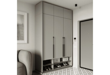 - Moreli, ламінована ДСП, ламінована ДСП, петлі з дотягувачами, регульовані ніжки, овальна чорна штанга, штанга і полиці, сучасний, кашемір, 3D.