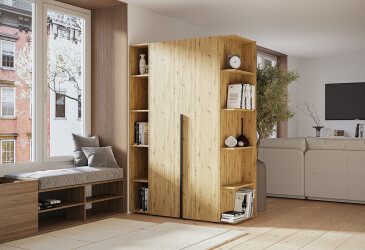 - MiroMark, скло, глянцева ДСП, ламінована ДСП, штанга і полиці, мінімалізм, дуб крафт / білий, 2D.