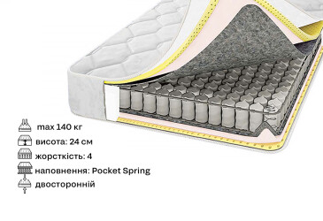 - 140х190, Світ Меблів, 240 шт, термофайбер, кокос, Пружини Pocket spring, бавовна, вовна, піна, спанбонд, biofoam, флексфайбер, 130, IV-V Жорсткий, II-III Середній, два рівні, Світ Меблів, На незалежній пружині Pocket, без вакуумної скрутки.