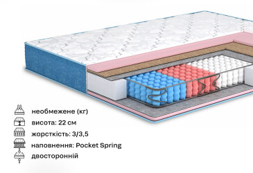 Матрац може мати залежні Bonnel пружини, незалежний блок пружин Pocket Spring або безпружинну конструкцію. Кожен з них має свої переваги та недоліки, з якими можна познайомитися у наших статтях або ж поспілкувавшись із консультантом.