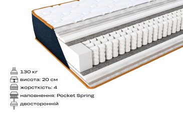 - 160х200, Світ Меблів, 240 шт, термофайбер, кокос, Пружини Pocket spring, бавовна, вовна, піна, спанбонд, biofoam, флексфайбер, 130, IV-V Жорсткий, II-III Середній, два рівні, Світ Меблів, На незалежній пружині Pocket, без вакуумної скрутки.