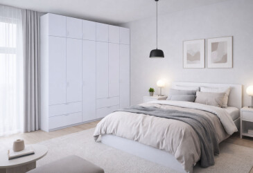- MiroMark, глянцева ДСП, ламінована ДСП, телескопічні напрямні повного висуву, штанга, полиці та шухляди, мінімалізм, білий, 6D.