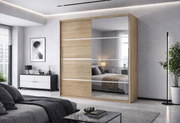 - Doros, ламінована ДСП, скло, ламінована ДСП, телескопічні напрямні повного висуву, штанга, полиці та шухляди, мінімалізм, дуб артизан / графіт, 4D.