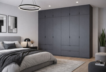 - в наявності, Doros, ламінована ДСП, ламінована ДСП, роликові напрямні, штанга, полиці та шухляди, мінімалізм, графіт, 5D.