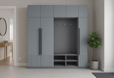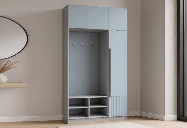 - Київський стандарт, МДФ, ламінована ДСП, система відкривання Tip-On, штанга і полиці, модерн, сіра лава / ніагара, 8D, з шафою із розкривними дверима.