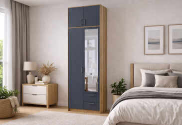 - Doros, ламінована ДСП, скло, ламінована ДСП, телескопічні напрямні повного висуву, штанга, полиці та шухляди, мінімалізм, дуб артизан / графіт, 2D.