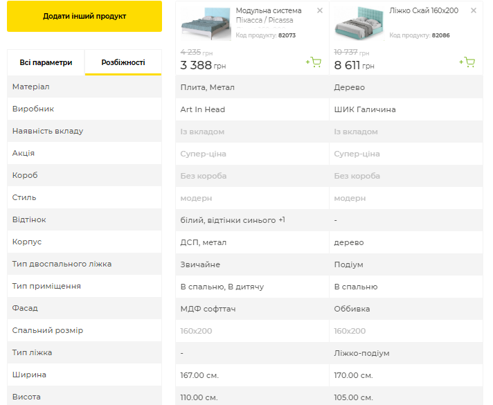 Функцію порівняння товарів впроваджено для тих, хто обирає між декількома моделями товару. Ця функція допоможе прийняти правильне рішення, адже за лічені секунди покаже розбіжності в параметрах товарів. Більше не потрібно відкривати декілька вкладок і робити аналіз, сайт все зробить за вас і подасть інформацію в зручному вигляді.
