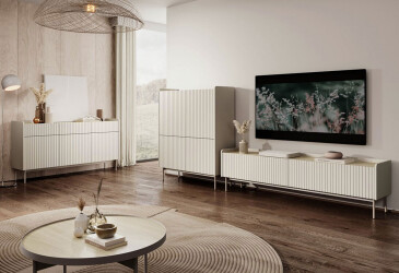 Вітальня Lante в чорному кольорі — це злиття елегантності з сучасністю та оригінальністю. Колекція вражає своїм унікальним характером, який походить з цікавих рифлених фасадів з МДФ, вигнутих країв, витончених чорних ручок та тонких завальцьованих ніжок.