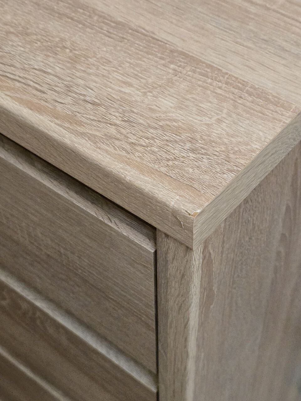 Комод виготовлений із якісних матеріалів, деталі вже із заводу мають підготовану розмітку для фурнітури, що значно полегшило збірку. Але під час розпаковки виявив пошкодженням - збитий кут верхньої кришки.
