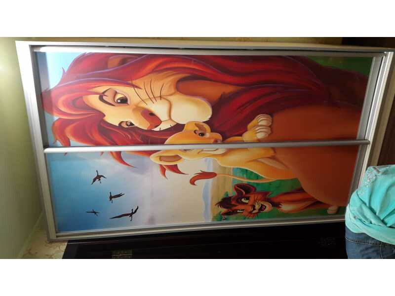 Шкаф красивый и вместительный, но разочаровало, что фотопечать не на стекле, а матовая, нет такого глянца, как на фото сайта. И сама картинка немного не соответствует представленному на сайте фото(над львом неба нет, грива до самого верха),что по-моему сделало общий вид немного наляпистым.Планка платильного шкафа была немного велика, подрезали. Шкаф не плохой, но как по мне цена завышена.