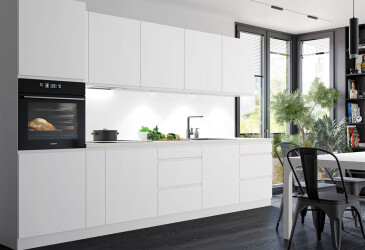 Фасади кухні - фарбована МДФ з матовою поверхнею, фрезерування і внутрішня рамка якого надає максимальне відчуття об'єму.