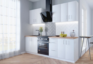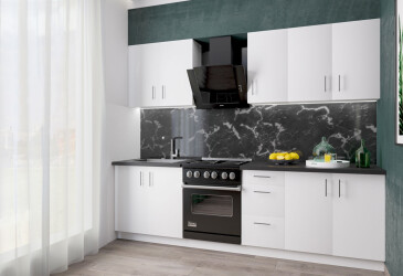 Також готові фабричні гарнітури можуть комплектуватися стільницею. А інші аксесуари (сантехніка для кухні, фартухи, рейлінгові системи, плінтуси та пристінні борти тощо) можна придбати окремо.