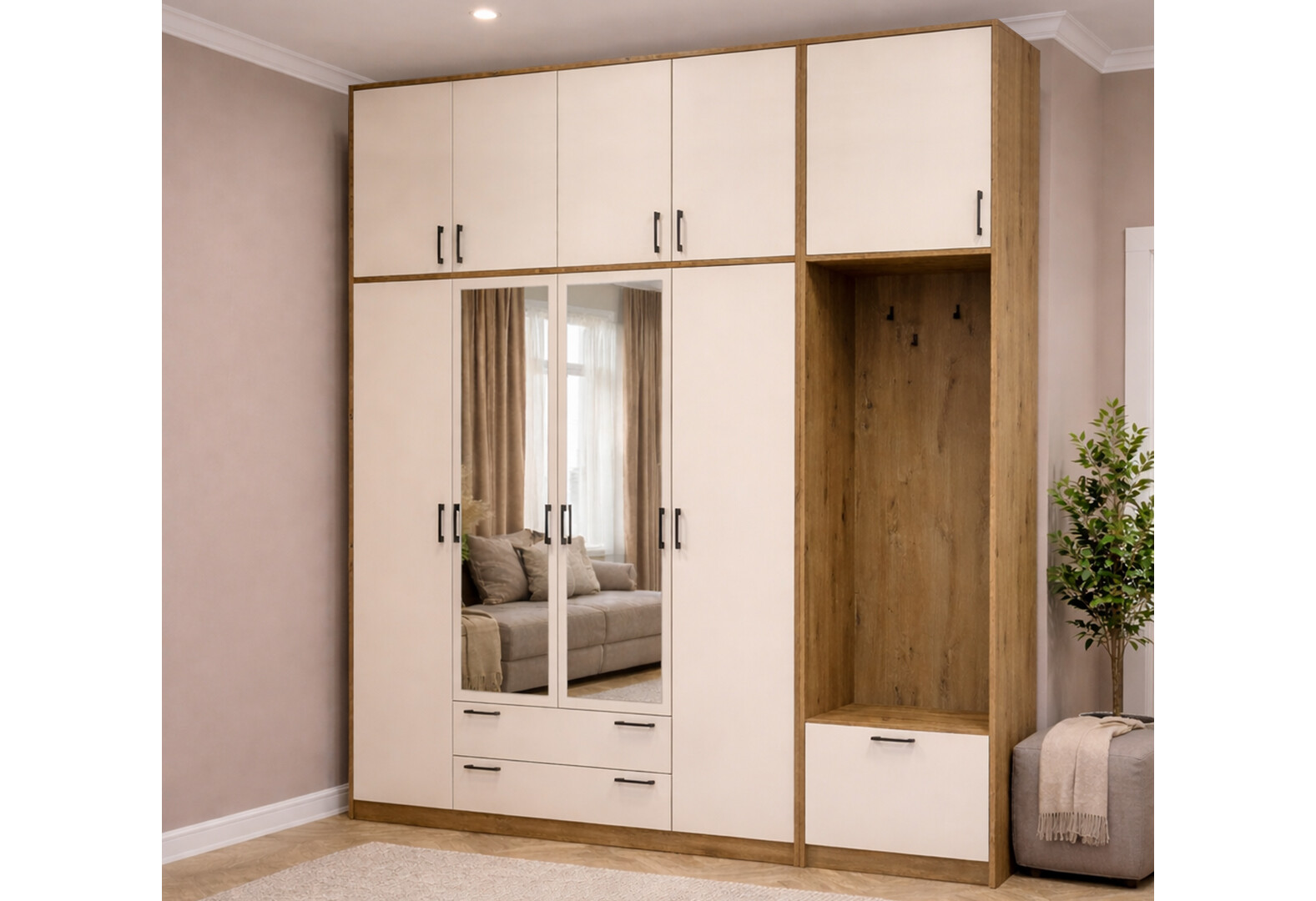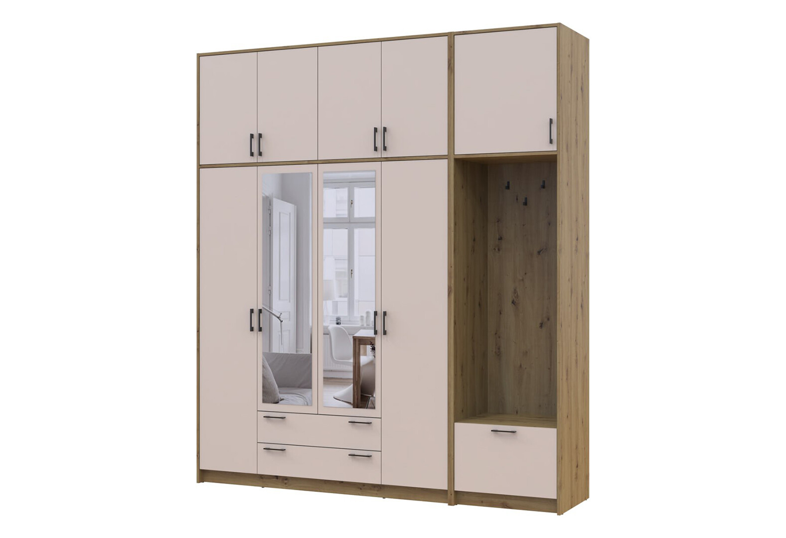 - Шафа для одягу 4 ДСП Doros Ронді з вішалкою, дзеркалом та високою антресолею 220 см Дуб Артізан / Кашемір