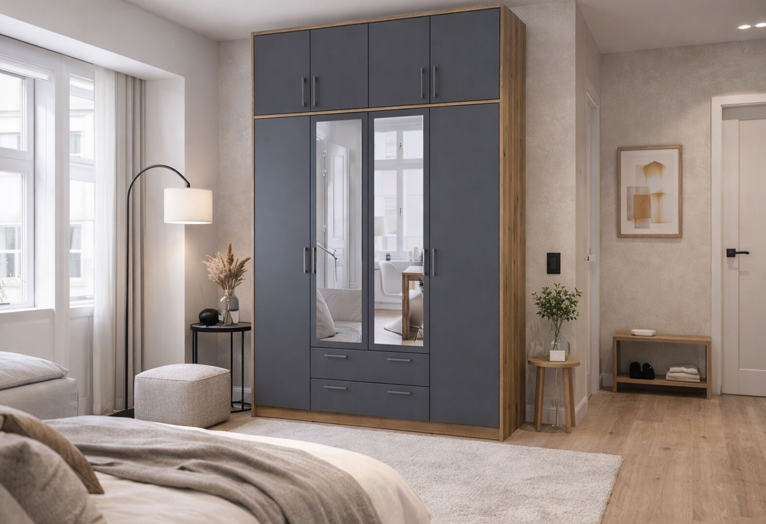 - Шафа Doros Ронді 4-дверна з дзеркалом, високою антресоллю і 2 шухлядами 160 см Дуб Артізан / Графіт