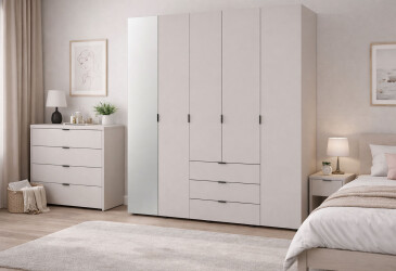 - Doros, ламінована ДСП, скло, ламінована ДСП, роликові напрямні, штанга, полиці та шухляди, мінімалізм, кашемір, 4D.