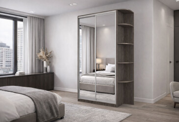 - Doros, ламінована ДСП, скло, ламінована ДСП, телескопічні напрямні повного висуву, штанга, полиці та шухляди, мінімалізм, дуб артизан / графіт, 4D.