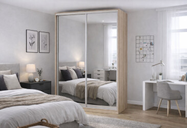 - Doros, ламінована ДСП, скло, ламінована ДСП, телескопічні напрямні повного висуву, штанга, полиці та шухляди, мінімалізм, дуб артизан / кашемір, 4D.