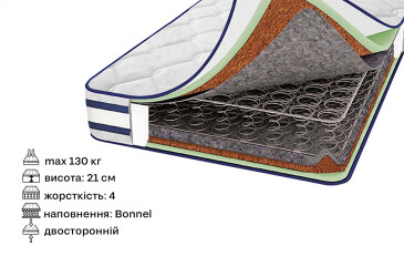 - 80х190, Світ Меблів, 135 шт, кокос, Пружини Bonnel, бавовна, піна, термоповсть, спанбонд, biofoam, флексфайбер, 130, IV-V Жорсткий, Світ Меблів, На класичній пружині Bonnel, без вакуумної скрутки.