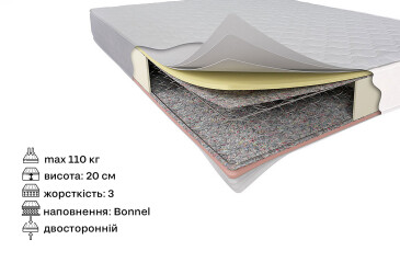 - 120х200, Світ Меблів, 135 шт, кокос, Пружини Bonnel, латекс штучний, бавовна, вовна, термоповсть, спанбонд, синтепон, 130, IV-V Жорсткий, Світ Меблів, На класичній пружині Bonnel, без вакуумної скрутки.