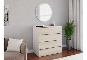 - Moreli, ламінована ДСП, ламінована ДСП, телескопічні напрямні повного висуву, модерн, білий / дуб сонома, з 4 шухлядами.