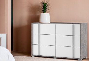 - MiroMark, глянцева ДСП, ламінована ДСП, телескопічні напрямні повного висуву, мінімалізм, білий, з 6 шухлядами.