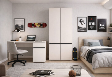 - в наявності, Doros, ламінована ДСП, ламінована ДСП, роликові напрямні, штанга, полиці та шухляди, мінімалізм, білий, 3D.